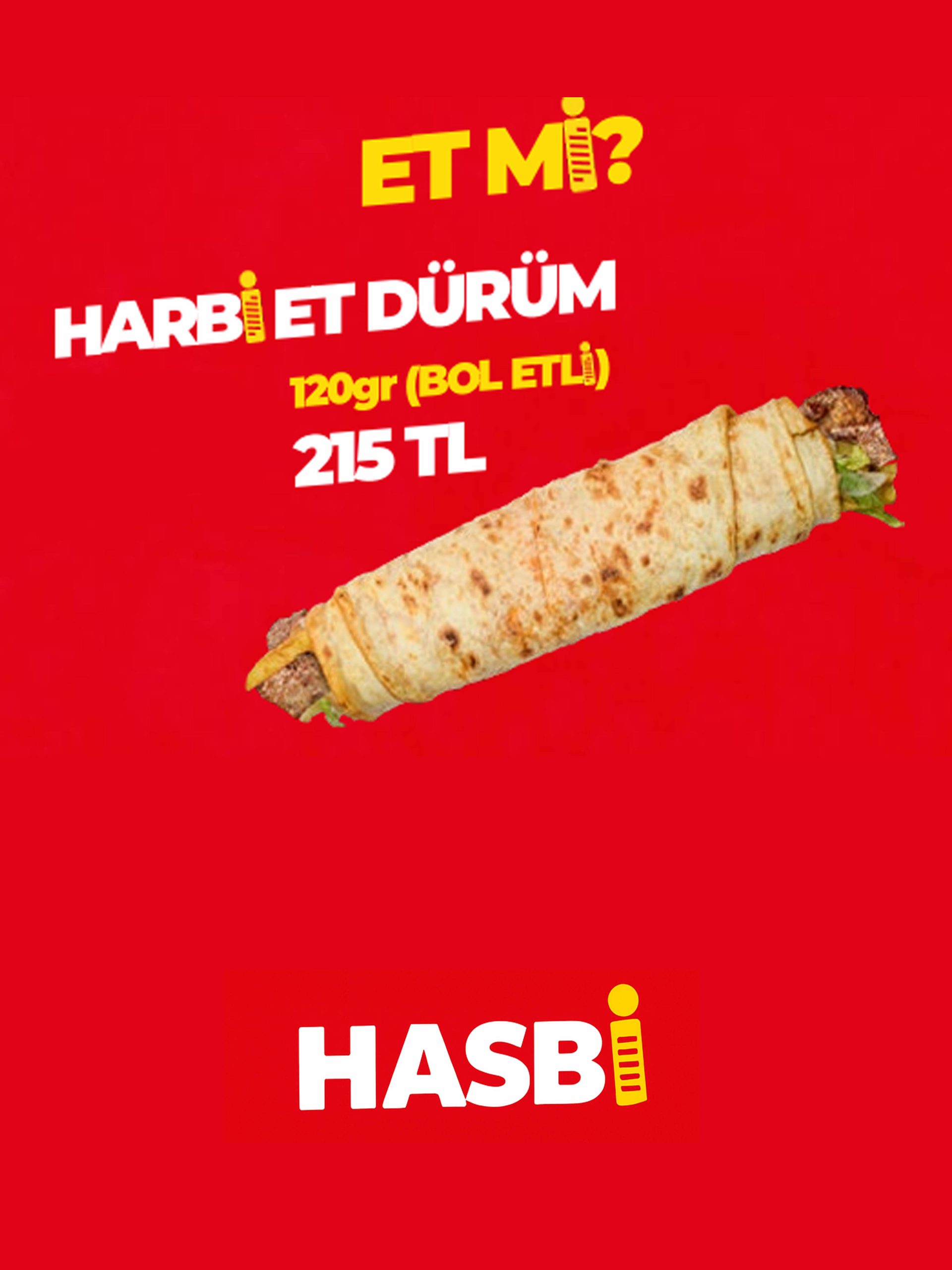 Hasbi Döner’in özenle seçilmiş dana etlerinden hazırladığı Harbi Et Dürüm, 120 gram saf et lezzetini ustalıkla harmanlayarak sana sunuyor. Ne sos, ne katkı, ne gizli karışım… Sadece etin kendi tadı, tandır ateşinin kokusu ve ustalıkla pişmiş dürümün doyurucu sıcaklığı! 🔥