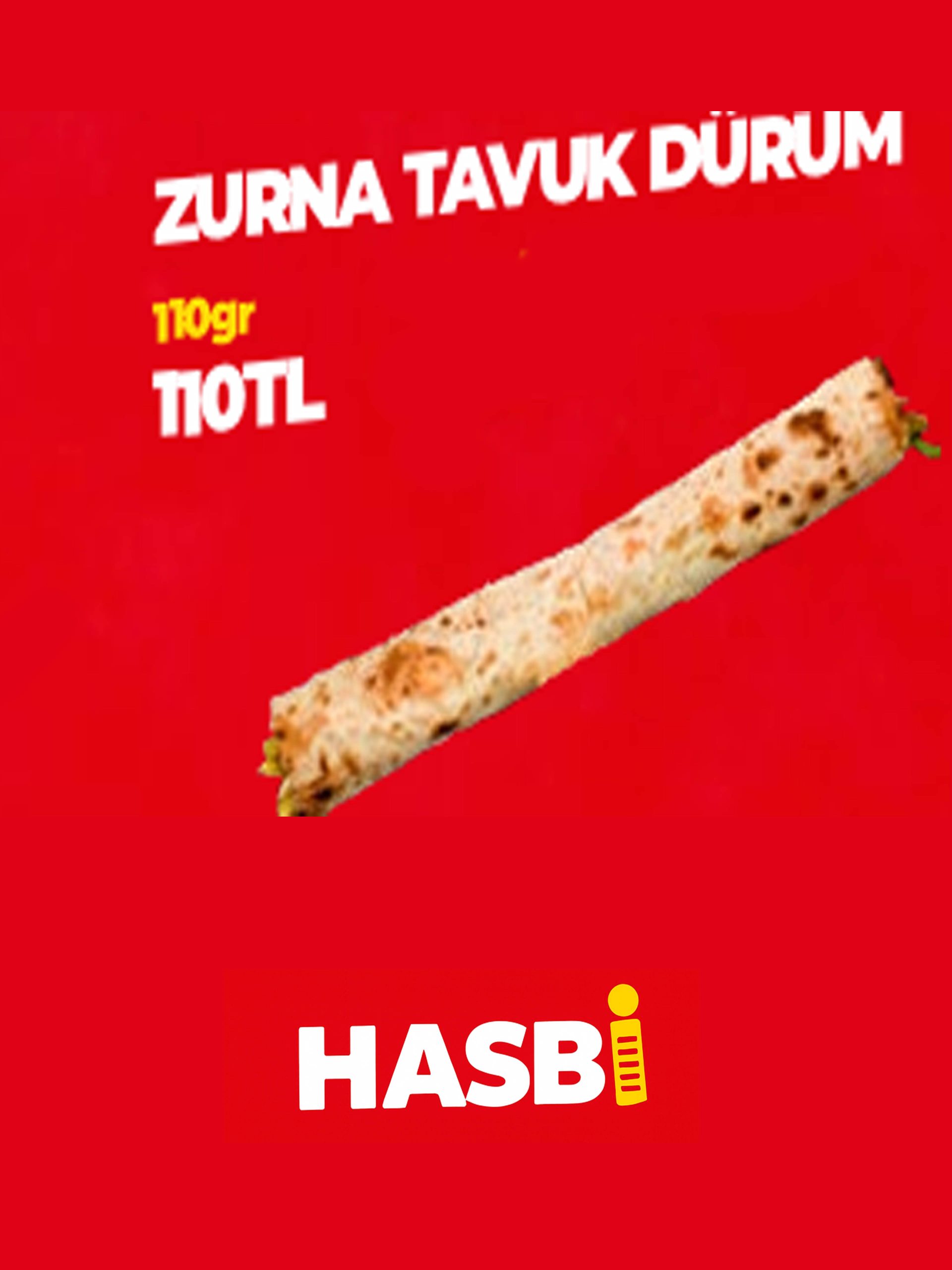 Hasbi Döner’in Zurna Tavuk Dürüm 110 gr seçeneği, günlük taze tavuk etlerinden hazırlanır, özenle marine edilir ve ustalıkla pişirilir.